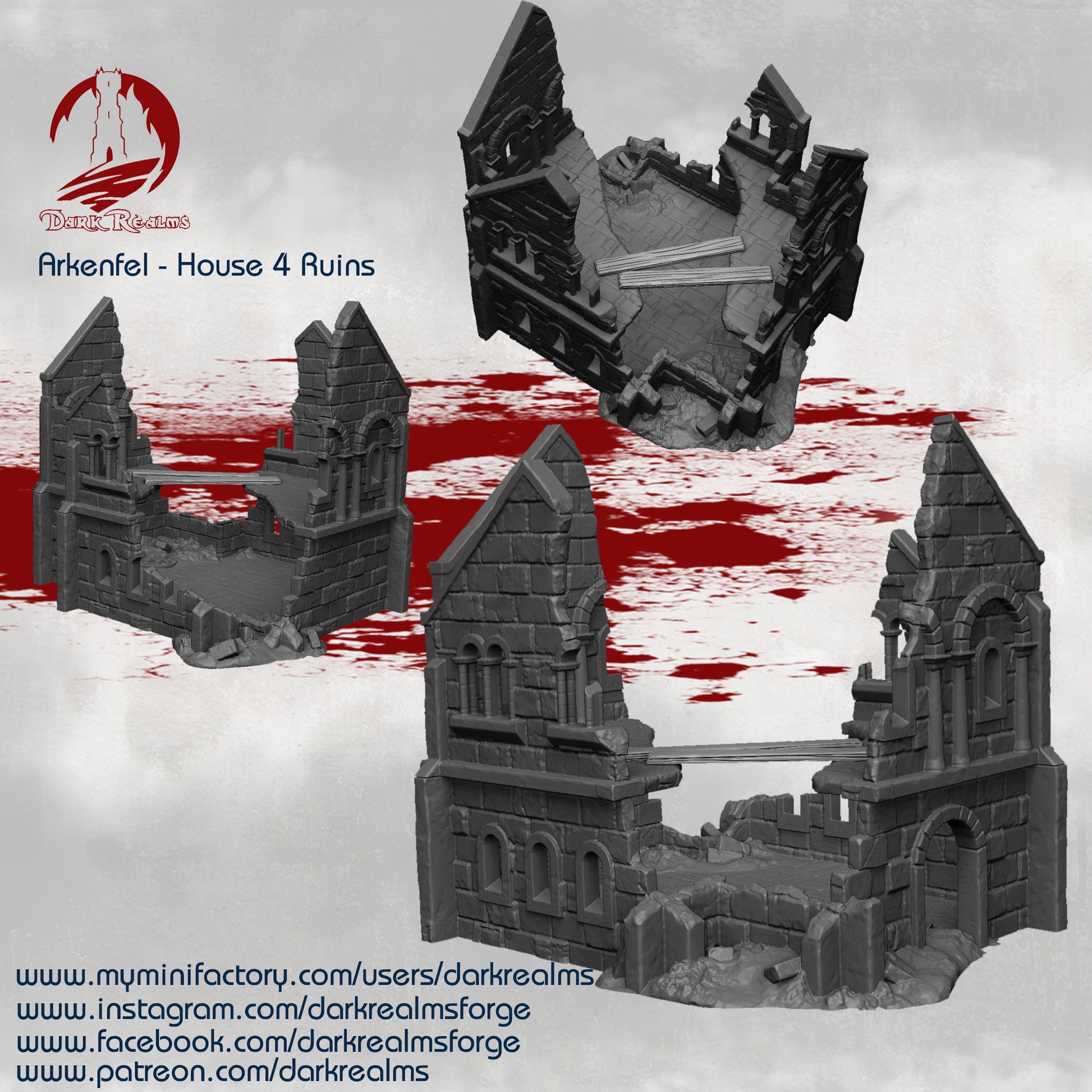 Amplía tu escenario de fantasía con esta Casa 4 de Arkenfel en ruinas, una estructura inspirada en la arquitectura de Gondor, perfecta para representar ciudades asediadas, pueblos abandonados o zonas de conflicto en mundos de fantasía medieval.
