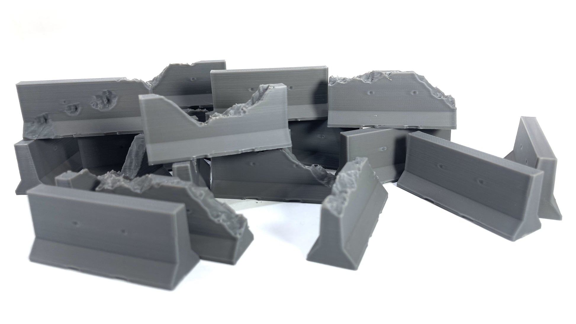 Fabricadas mediante impresión 3D FDM de alta calidad en PLA gris premium, ofrecen una textura limpia y resistente, ideal tanto para pintores como para jugadores que buscan escenografía duradera y funcional. Cada barrera mantiene proporciones realistas a escala 28mm, encajando perfectamente en juegos como Warhammer 40K, Infinity, Fallout Wasteland Warfare, Zona Alfa o Bolt Action.