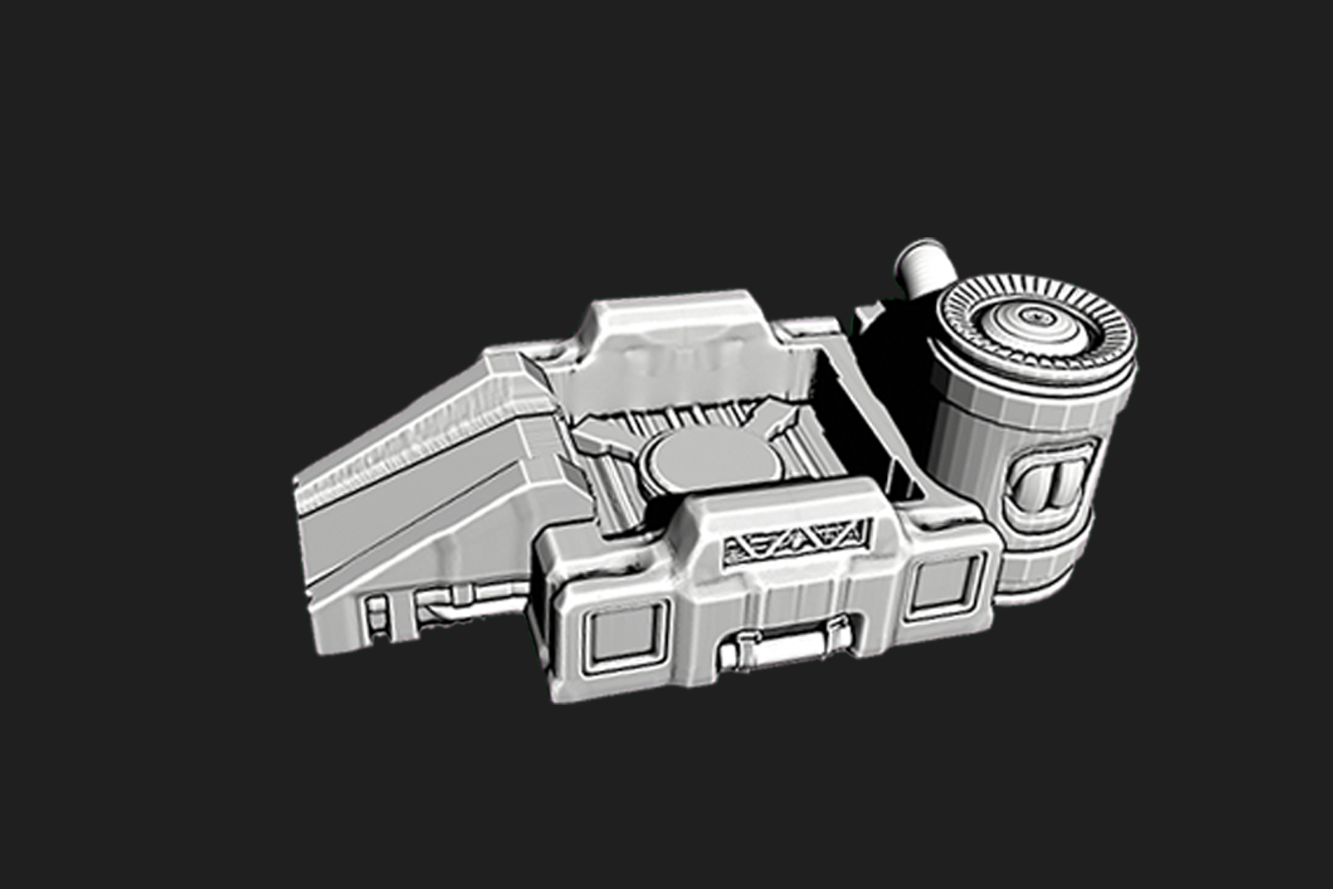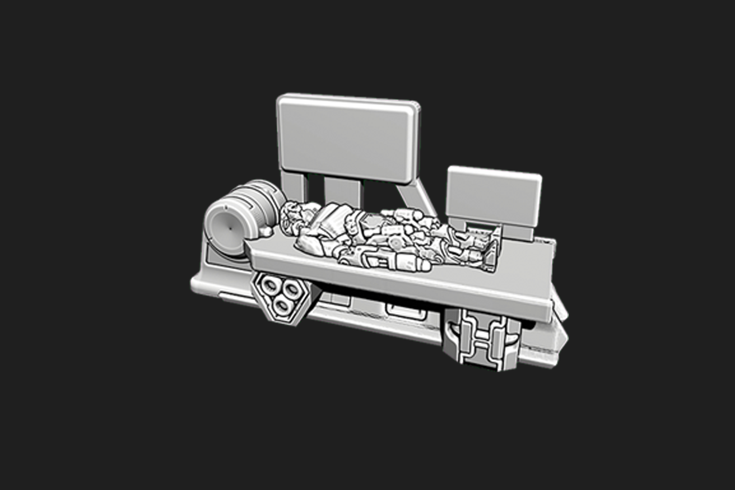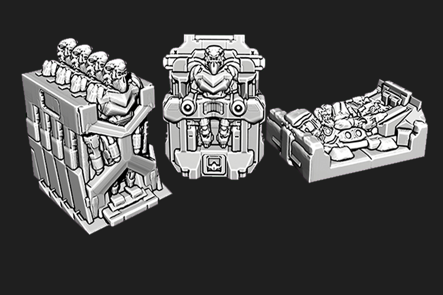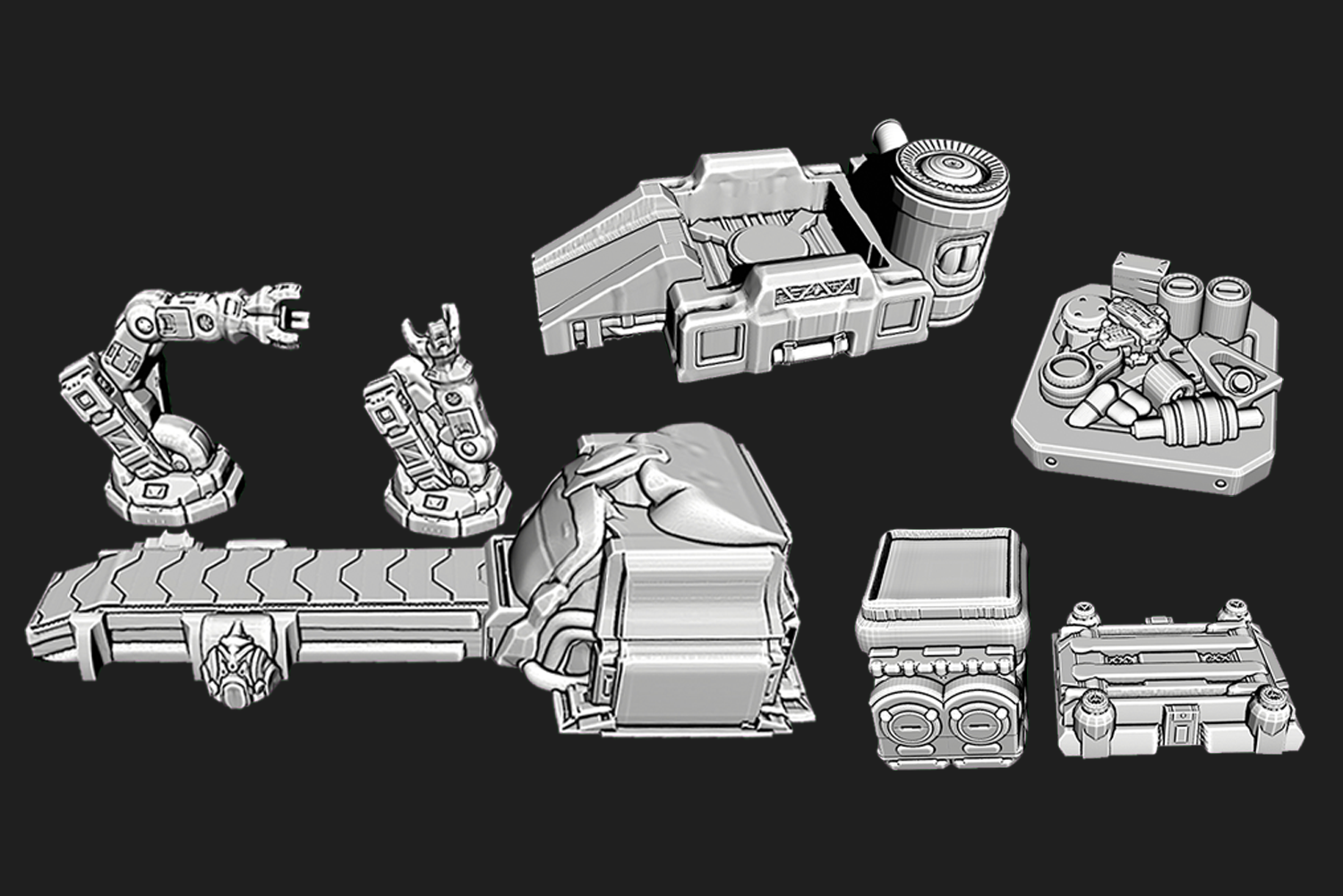 Conjunto modular de escenografía industrial que representa una línea de fabricación automatizada con maquinaria y estructuras técnicas, pensado para mesas de ciencia ficción y compatible con escalas 28mm, 32mm y 15mm.
